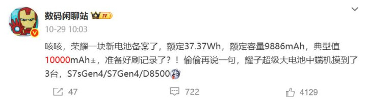 据博主数码闲聊站爆料,荣耀这边除了搭载天玑8500处理器的荣耀power 2在测试10000mAh电池,还会有一款搭载骁龙7系芯片的手机采用10000mAh电池,更低端的系列那就是x系列了,预计这款手机是荣耀x80。