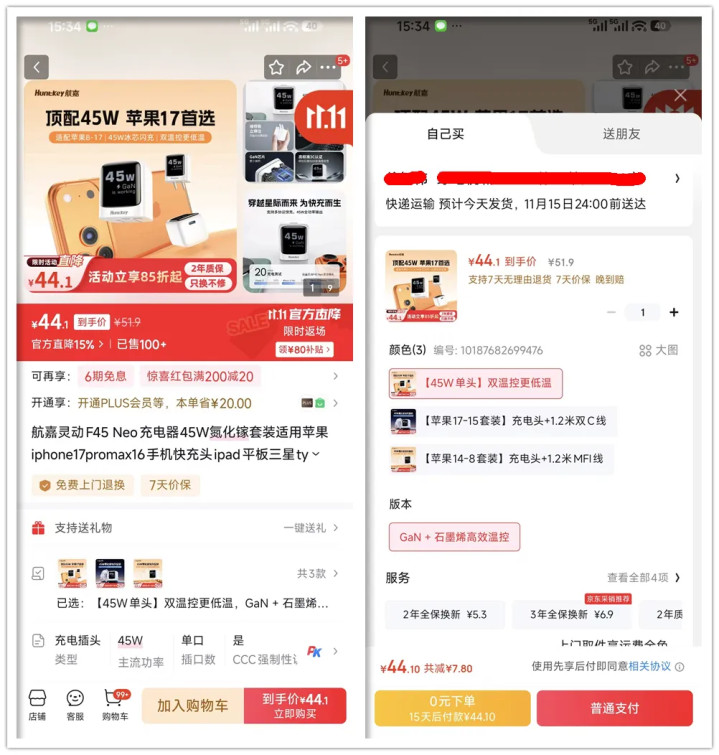 第一款是航嘉灵动F45 Neo充电器,这是新出的45W小头,目前最低能做到44元,而且狗东比PDD便宜5块。