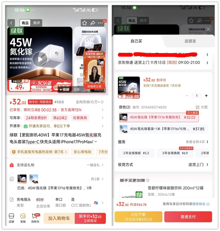 第三款是绿联,这也是目前牌子货里最便宜的45W小头子,全新最低32元,正好是苹果原充的1折,官方数据是30分钟能充iPhone17系列70%的电。