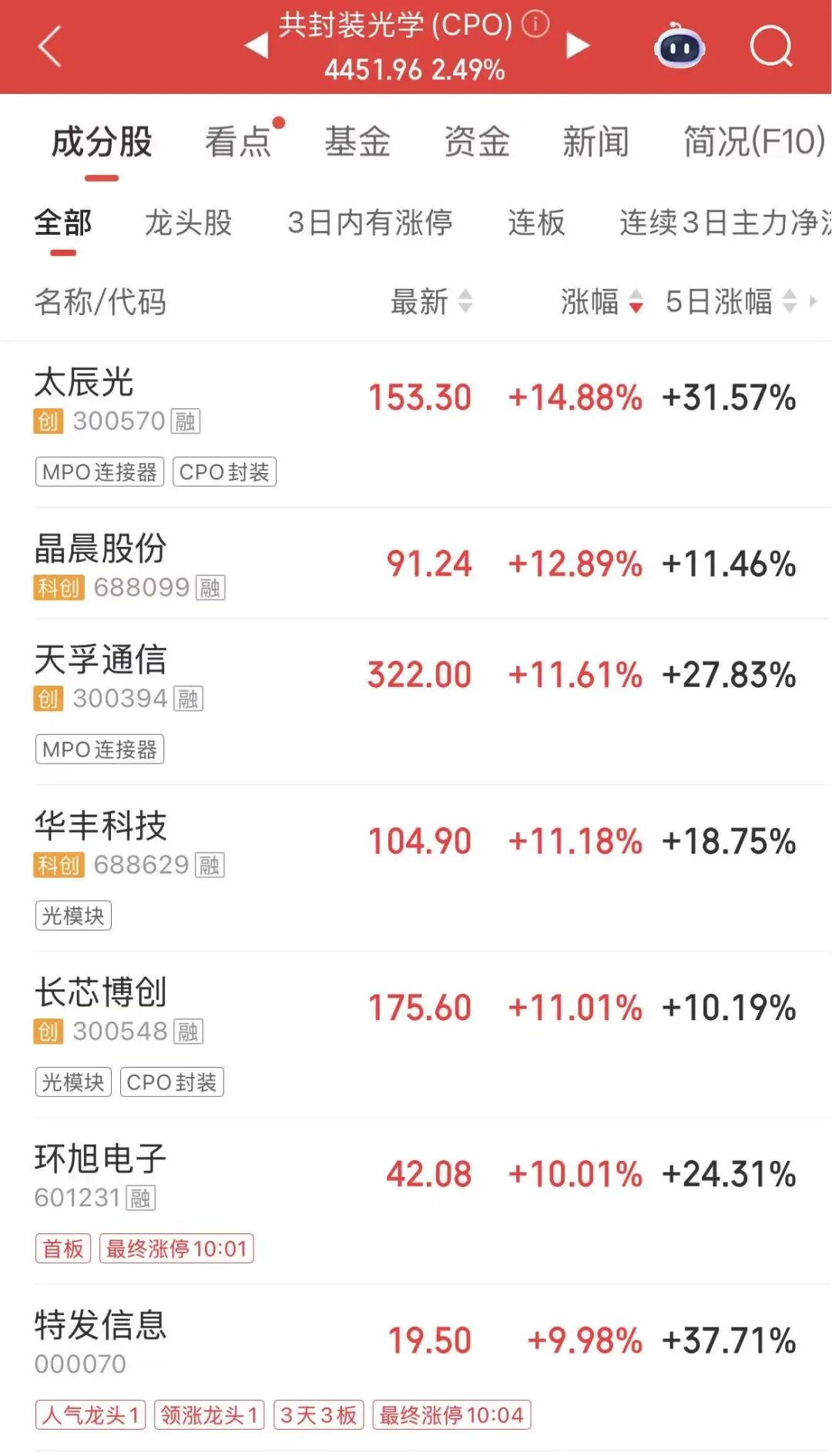 上午,CPO、液冷服务器、光芯片、光电路交换机等算力硬件股集体走强,天孚通信、太辰光等多股创历史新高。CPO概念龙头天孚通信上涨11.61%,报322元/股,股价创历史新高,最新市值为2503.3亿元。