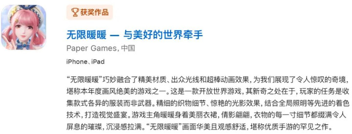 前不久苹果公布2025 App Store Awards入围作品,《无限暖暖》被提名年度游戏。
