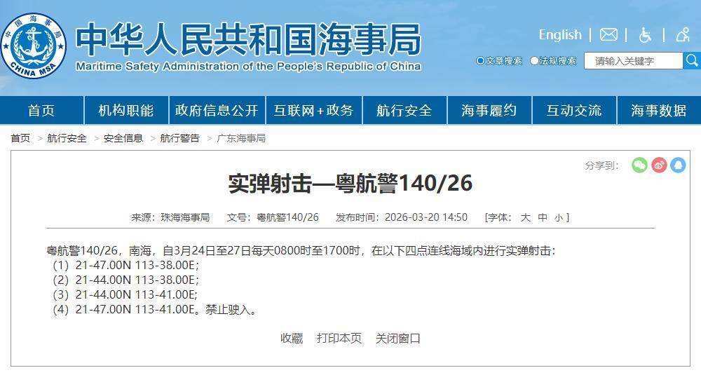 据中国海事局网站消息,珠海海事局发布航行警告,3月24日至27日每天8时至17时,南海部分海域进行实弹射击,禁止驶入。