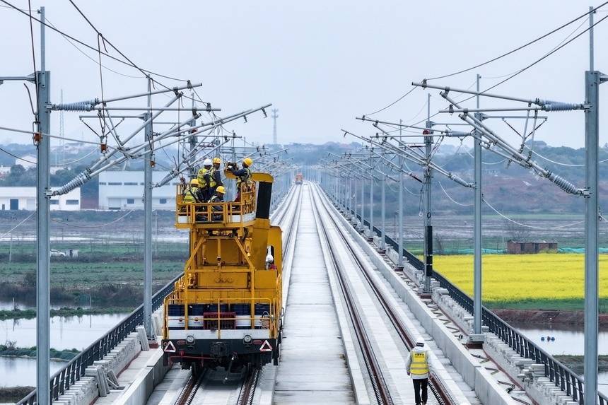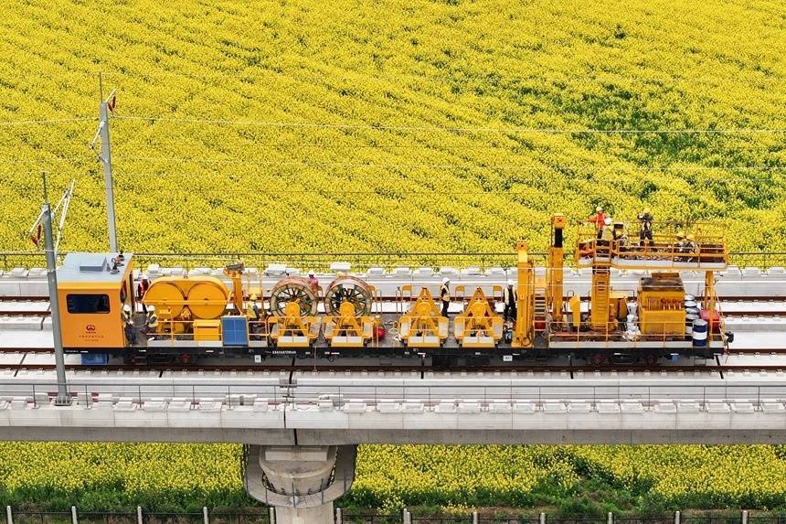 人民网共青城3月28日电 28日,在昌九高铁庐山南站至共青城东站区间施工现场,随着恒张力放线轨道车缓缓启动,首条接触网导线平稳架设到位,标志着昌九高铁全线接触网架设工作正式拉开帷幕,工程建设进入最后冲刺阶段。