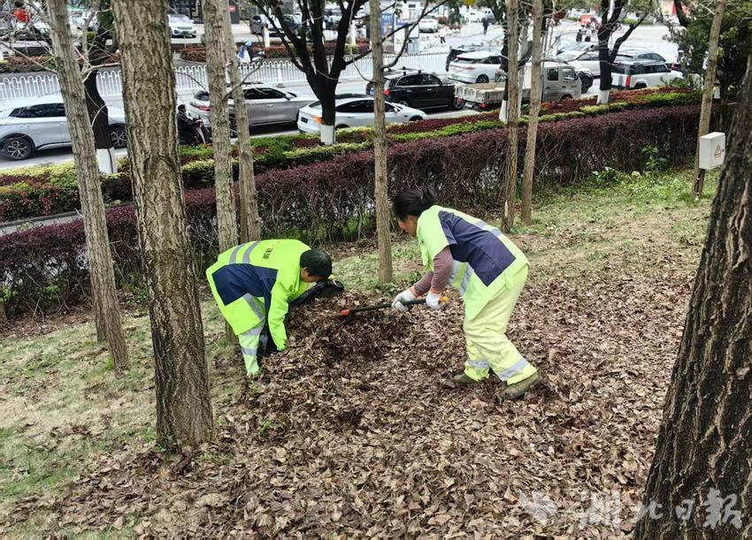 湖北日报客户端讯(通讯员 谭华 黄玉梅 )3月26日,环卫作业人员集中清理恩施州文化中心周边公共区域的落叶。